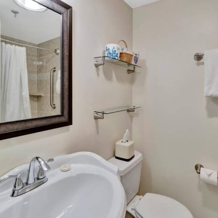 - The en-suite bathroom features a shower/tub combination, a toilet, and a sink.