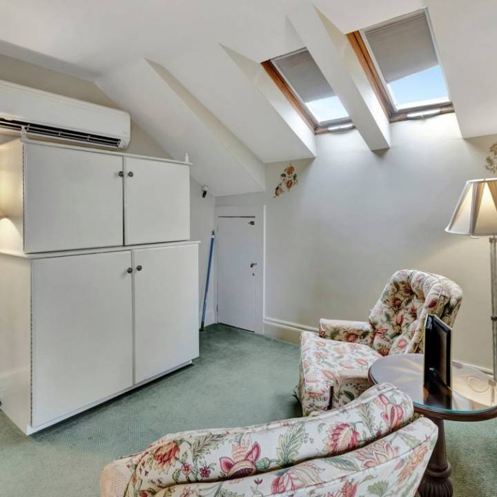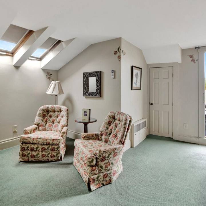 - Two small skylights grace the main room, casting gentle illumination upon the space.