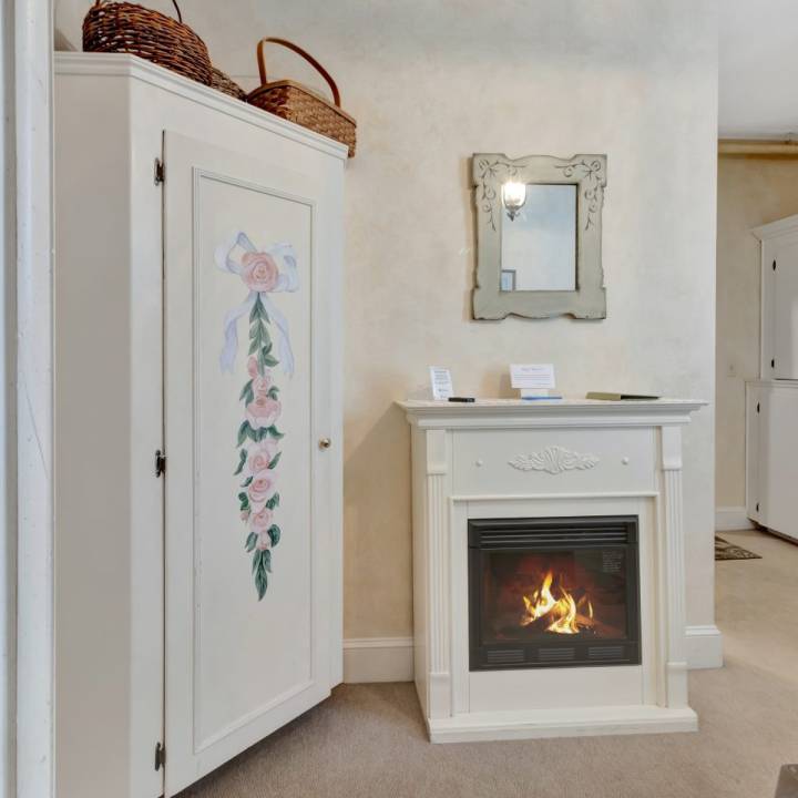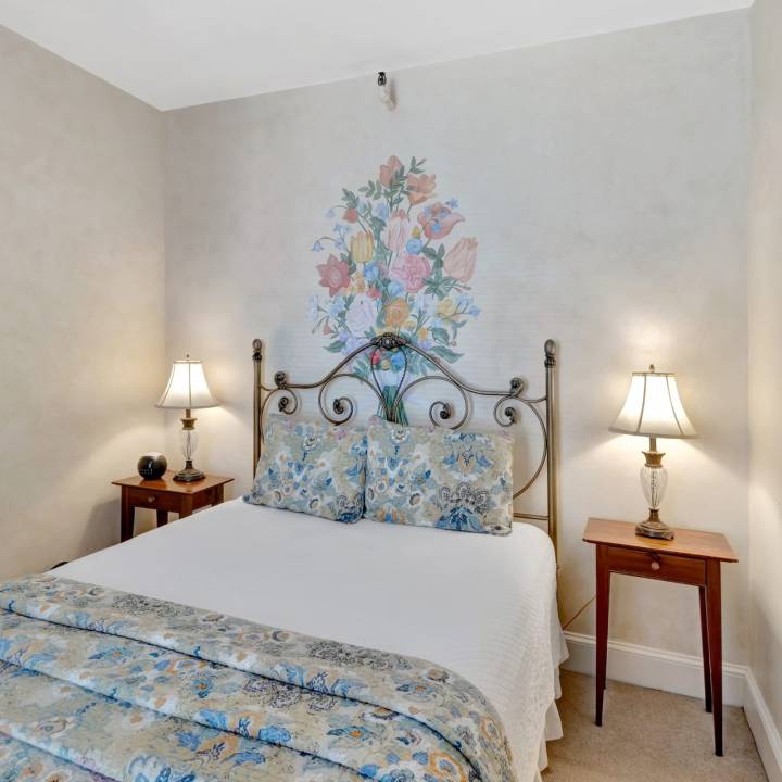 - The adjoining room boasts hand painted walls, a queen bed, ensuring a restful night’s sleep.