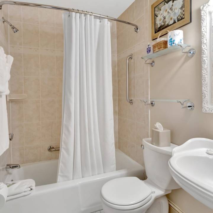 - The en-suite bathroom offers a shower/tub combination, a toilet, and a sink.