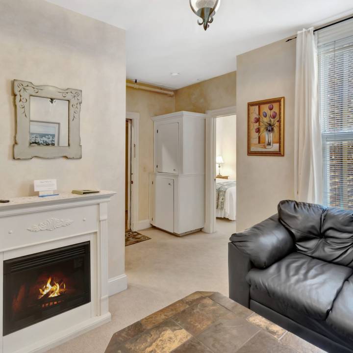 - A spacious sitting area adorned with a plush leather love seat, a coffee table, and an inviting electric fireplace.