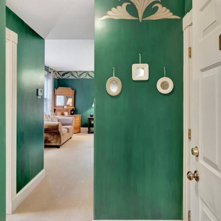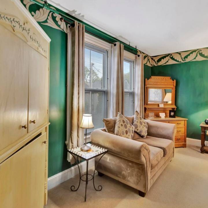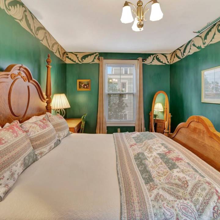 Room 5, nestled on the second floor at the rear of the building, offers a serene and secluded haven of artistically adorned, hand painted walls in calming hunter green. Here are the exquisite details awaiting you: