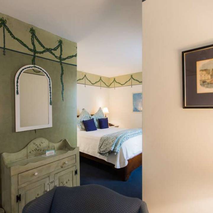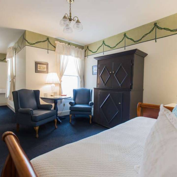 - A regal, antique, queen bed, adorned with fine linens, awaits your slumber.