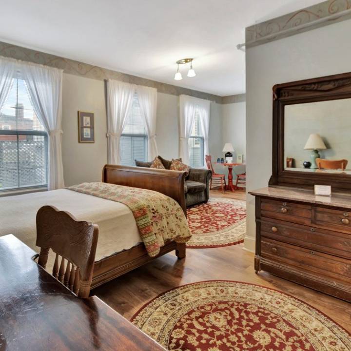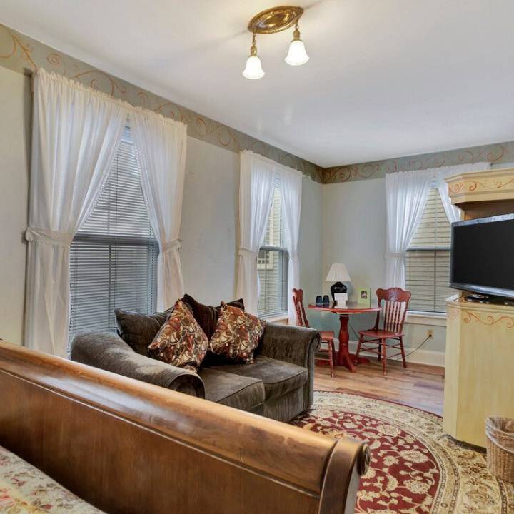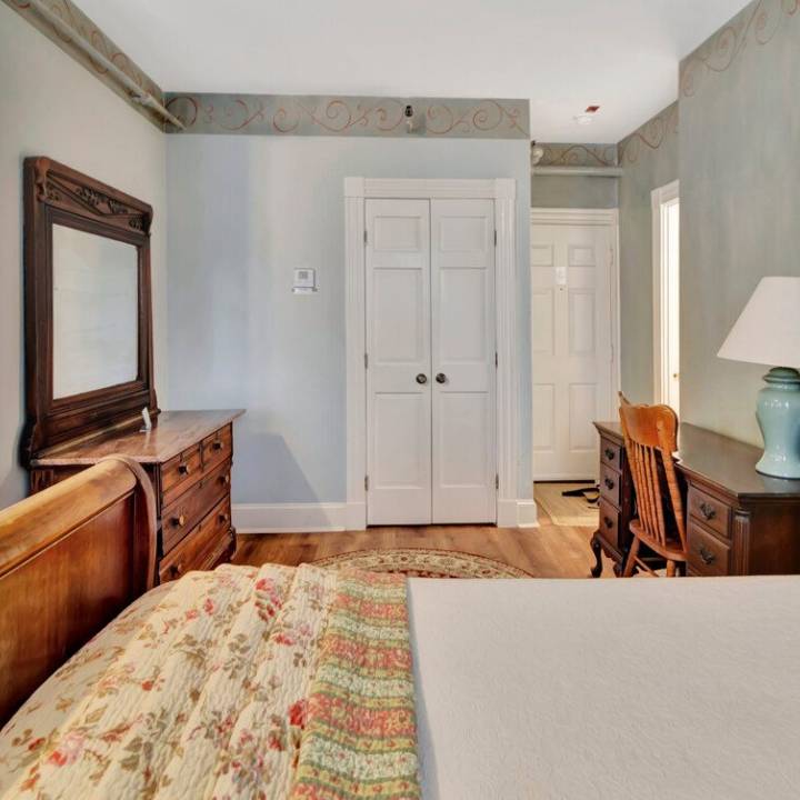 - A queen sleigh bed, adorned with sumptuous linens, awaits your restful nights.